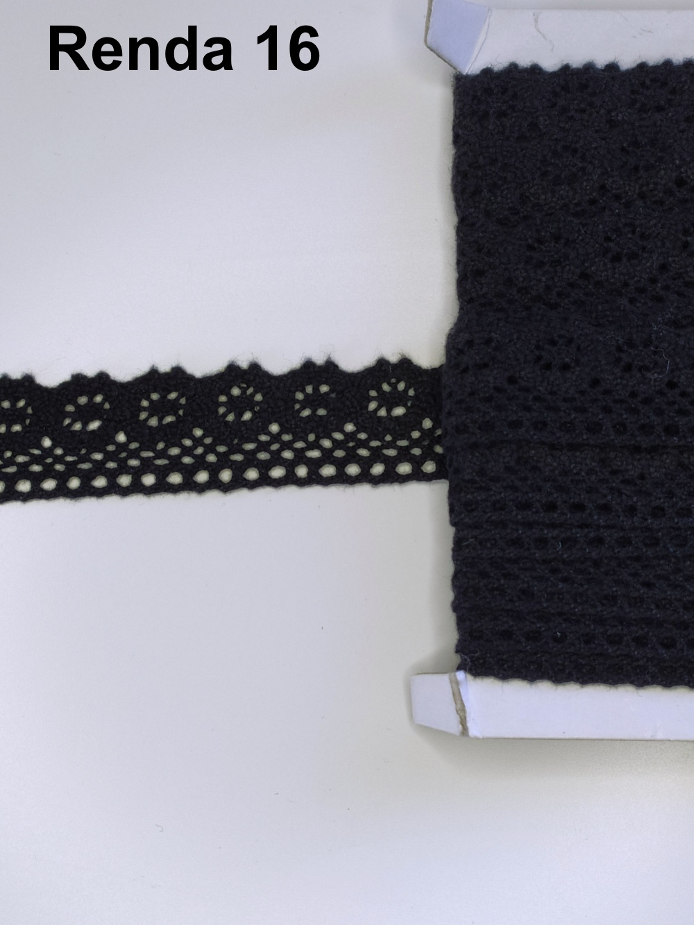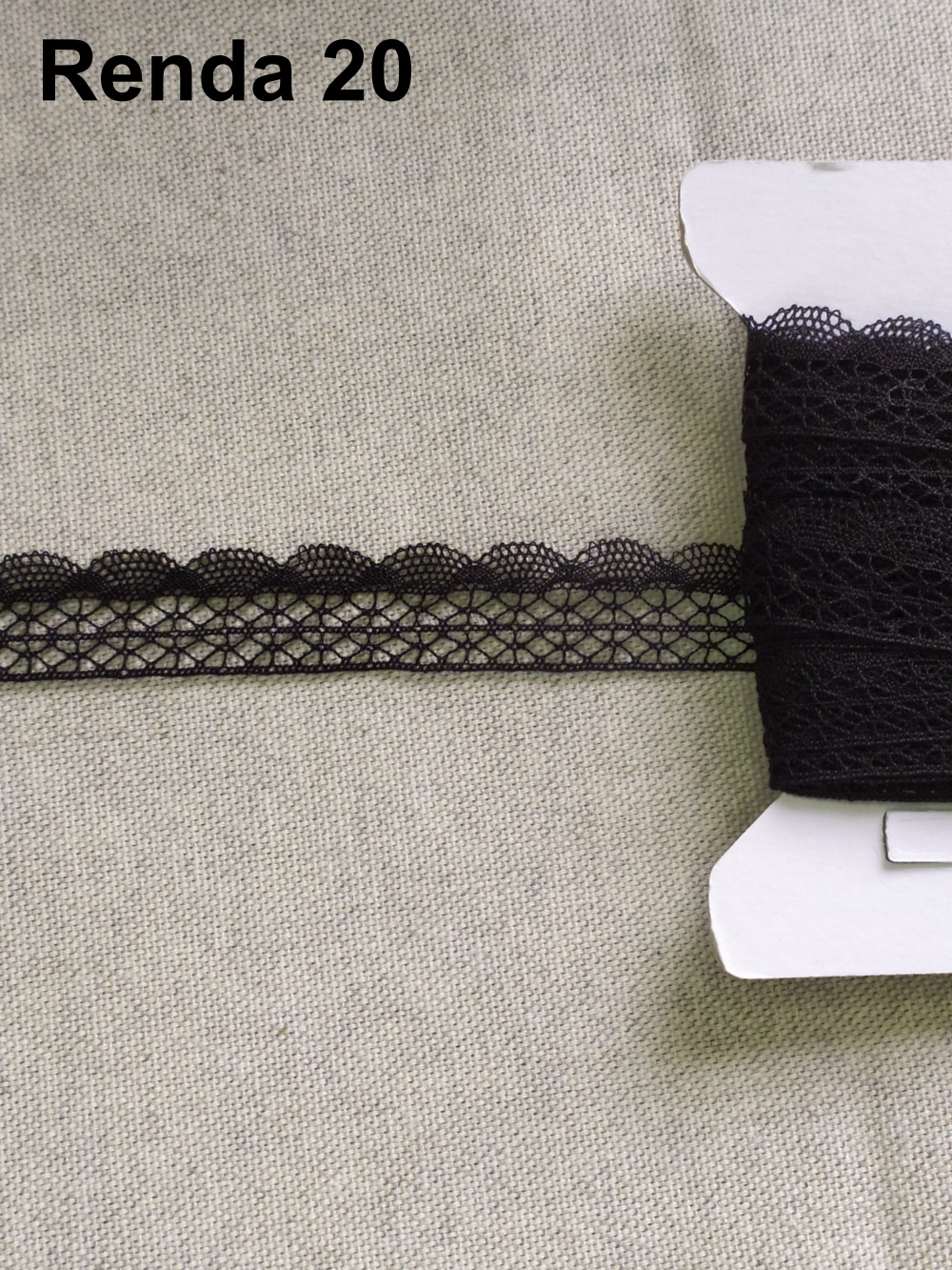 Rolo de renda preta com padrão floral e etiqueta 'Renda 20' sobre fundo cinza