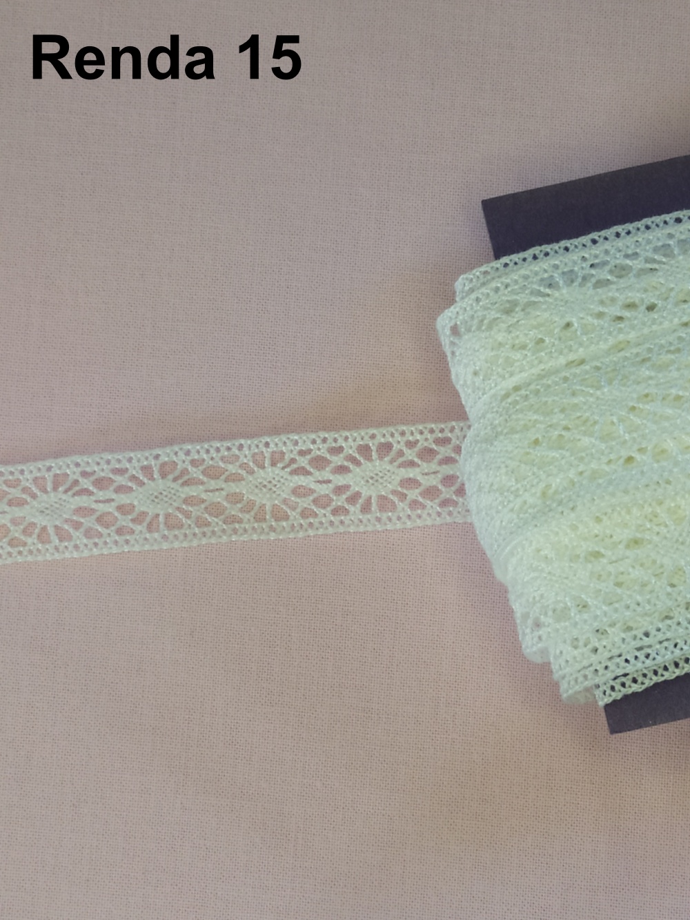 Rolo de renda branca com padrão floral sobre fundo rosa com texto 'Renda 15'