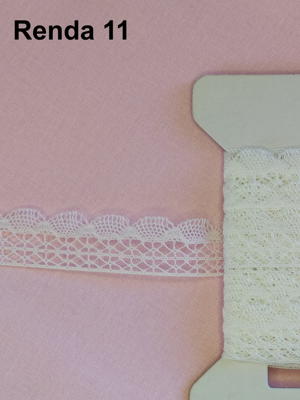 Fita de renda branca em cartão com texto Renda 11 em fundo rosa