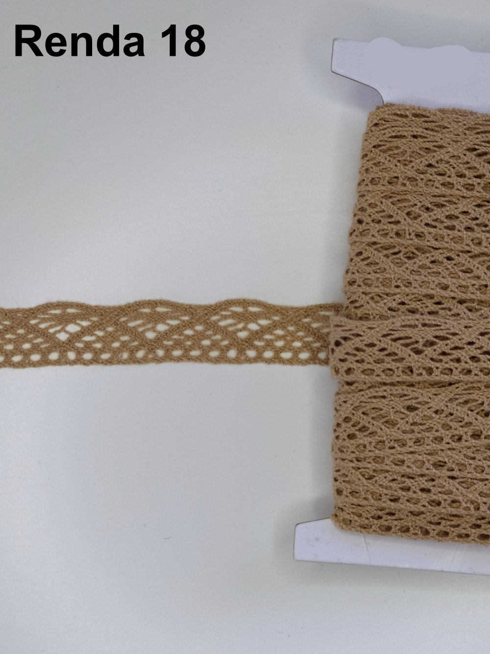 Renda castanha clara enrolada em cartão branco com padrão de malha aberta e texto 'Renda 18'