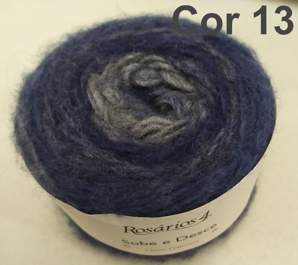 Novelo de lã azul e cinzento com rótulo Rosários 4 em fundo claro