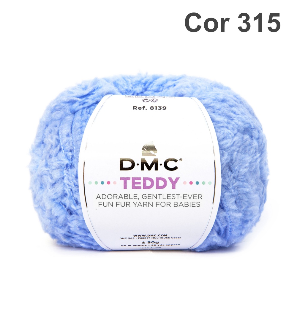 Novelo de lã azul tipo pelúcia DMC TEDDY com etiqueta branca