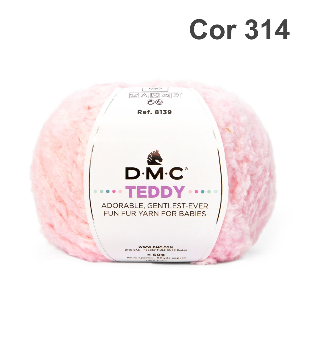 Novelo de lã cor de rosa claro com etiqueta branca D.M.C TEDDY