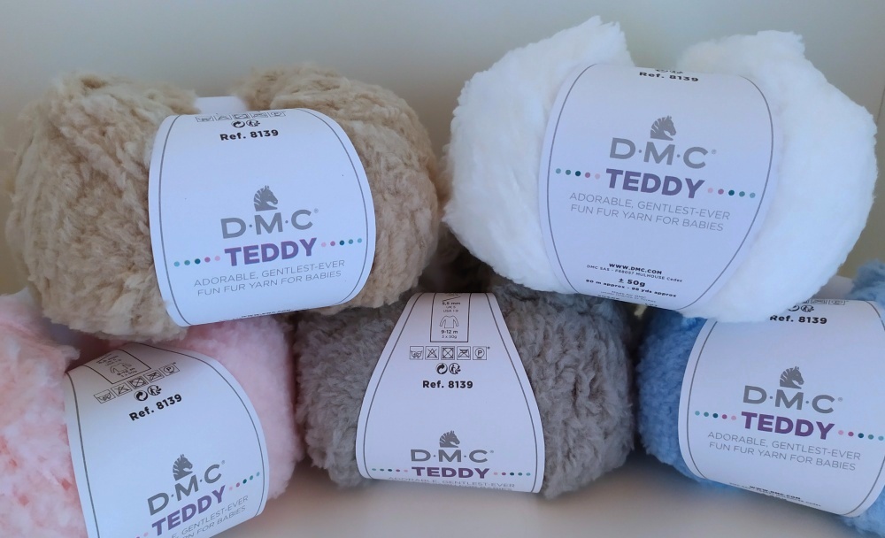 Cinco novelos de lã DMC TEDDY em cores bege, branco, rosa, cinzento e azul com etiquetas brancas.