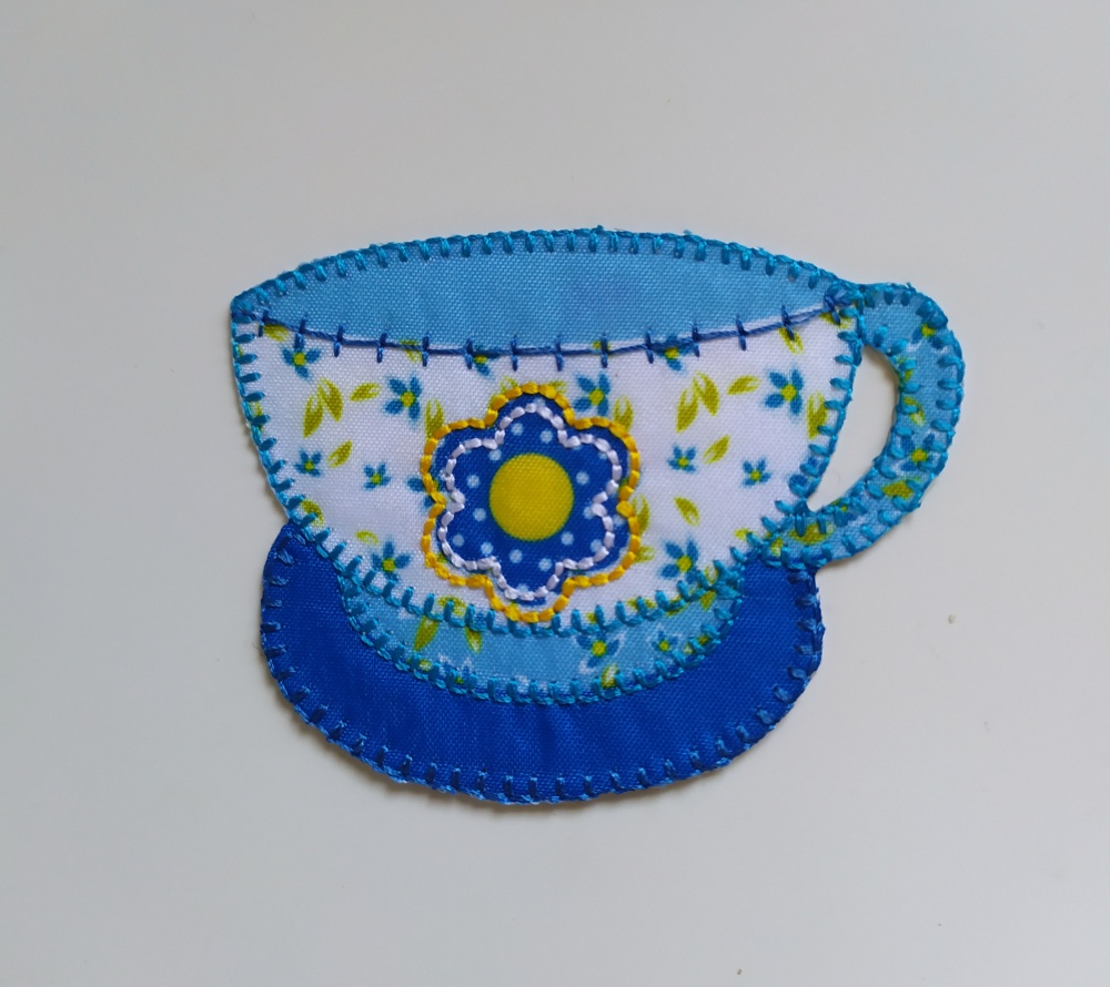 Aplicação decorativa tecido chávena azul com flor e folhas verdes