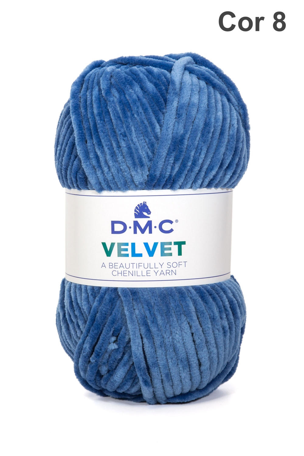 Novelo de fio chenille azul-veludo marca D.M.C com etiqueta e indicação de cor Cor 8