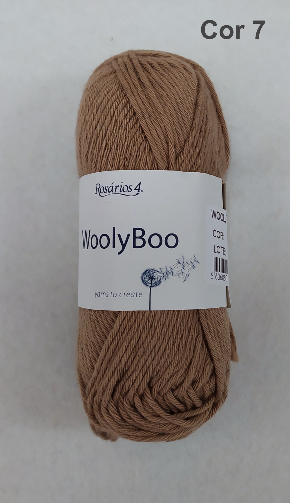Novelo de lã castanha clara com etiqueta Rosários 4 WoolyBoo Cor 7