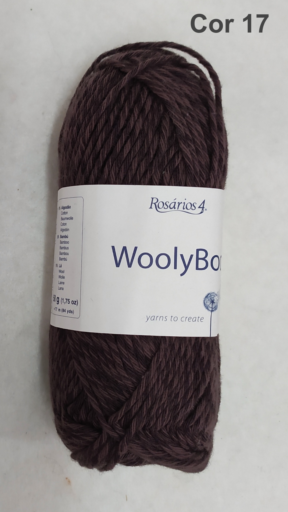 Novelo de fio castanho escuro Rosários 4 WoolyBo com etiqueta branca