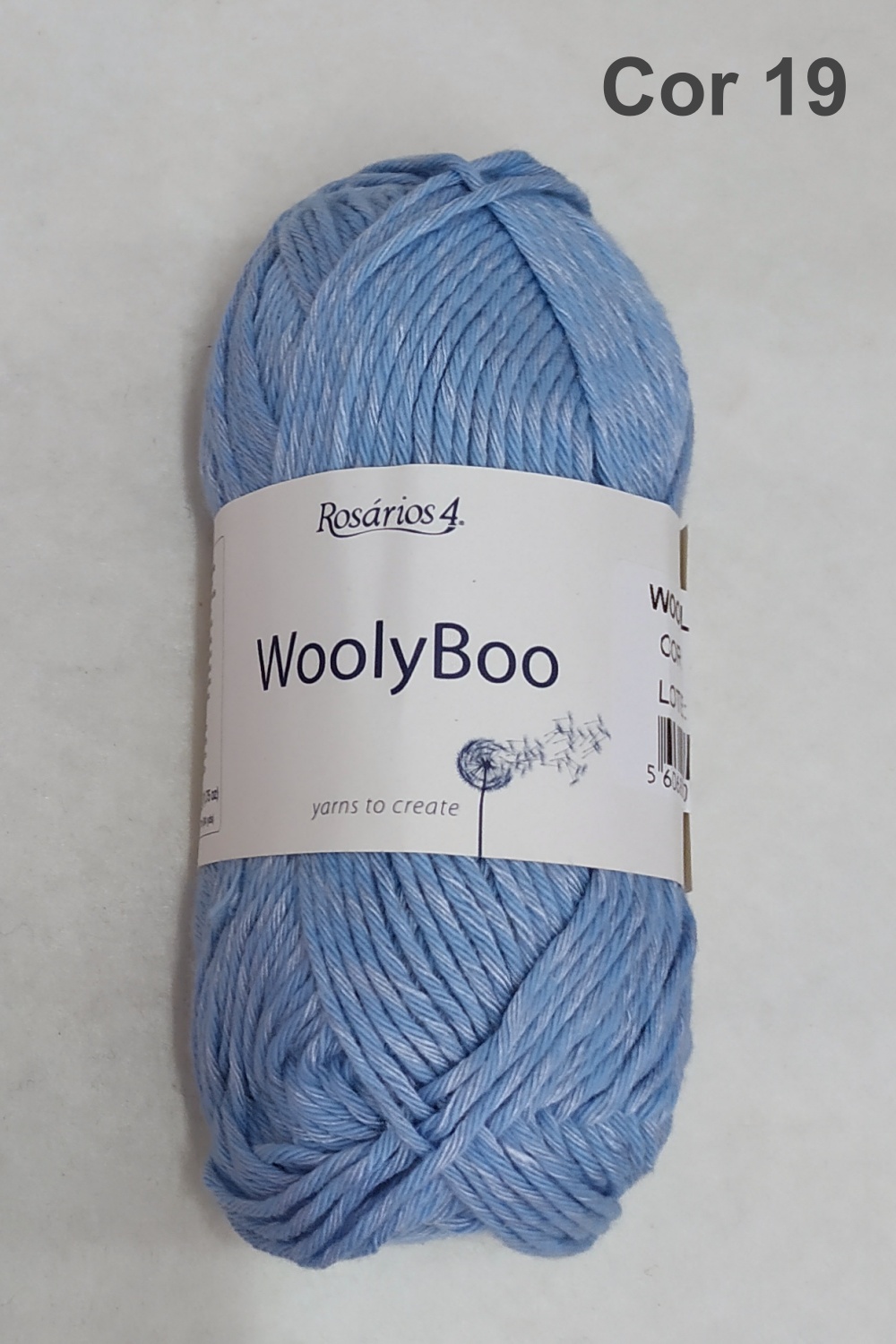 Novelo de lã azul claro WoolyBoo com rótulo branco e ilustração de dente de leão