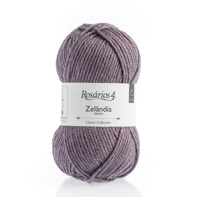 Novelo de lã grosso cinzento-roxo com etiqueta da marca Rosários 4 Zelândia